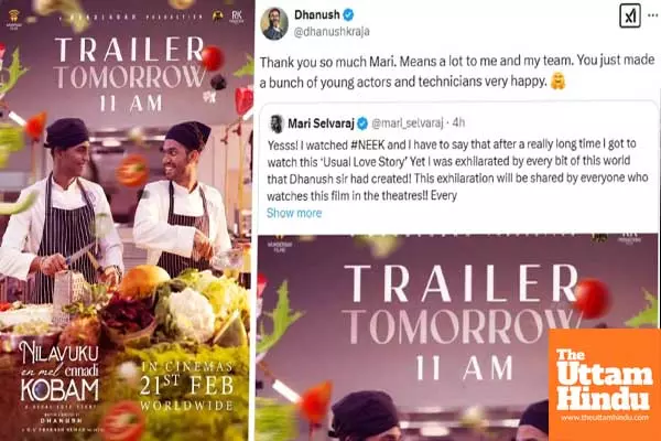 Chennai (The Uttam Hindu) : One of Tamil cinema’s top directors Mari Selvaraj has showered praise on director Dhanush’s upcoming film, Nilavukku Enmel Ennadi Kobam (NEEK), saying that he had watched the film and was “exhilarated by every bit of this world that Dhanush had created.” Taking to his X timeline to register his thoughts on the film, Mari Selvaraj wrote, "Yesss! I watched #NEEK and I have to say that after a really long time I got to watch this ‘Usual Love Story’.