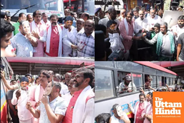 Bengaluru (The Uttam Hindu) : The Karnataka BJP staged a unique protest on Friday at the Kempe Gowda Bus Station in Bengaluru's Majestic locality by distributing roses to male passengers following a 15 per cent bus fare hike by the Congress government. The protest was led by the Leader of Opposition in the state Assembly, R. Ashoka and LoP in the Legislative Council, Chalavadi Narayanaswamy. Some activists wore masks of Chief Minister Siddaramaiah and Deputy CM D.K. Shivakumar and raised slogans against them and the Congress government. The leaders told the passengers after giving them roses that the ticket price hike was a "gift" from the ruling Congress party. High drama ensued when the police attempted to stop the BJP leaders from distributing the roses. Ashoka lost his cool and warned the police officers, saying he had noted their names and that the Congress government wouldn't last long.