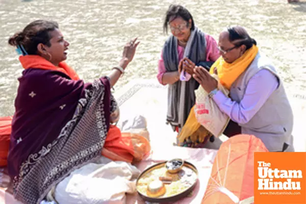 Caption : Prayagraj: Devotees seek blessings from a kinnar sadhu during the Maha Kumbh Mela 2025 at the Sangam in Prayagraj on Monday, January 20, 2025.