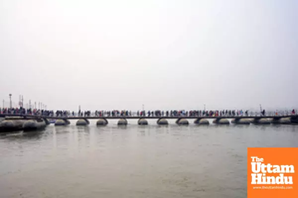 Caption : Prayagraj: Devotees walk over the pontoon bridges over the Sangam, the confluence of the rivers Ganges, Yamuna, and Saraswati, in Prayagraj during Maha Kumbh 2025, on Sunday, January 12, 2025.