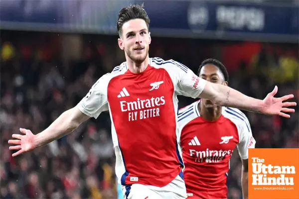 London (The Uttam Hindu): Arsenal produced a dominant 3-0 win over Real Madrid in the first leg of their Champions League quarter-final, thanks to two brilliant free-kicks by Declan Rice and a clinical finish from Mikel Merino. Arsenal quickly asserted control in the match, creating early chances in the 13th minute. Rice had a shot blocked by Raul Asencio, and Thibaut Courtois made a vital save to deny Thomas Partey’s low effort. As the game progressed, both teams ramped up the pressure, and goalkeepers on both ends were kept busy. David Raya made a crucial stop from Kylian Mbappé at close range, while Courtois pulled off a stunning double save to keep out a header from Rice and a follow-up shot from Gabriel Martinelli.