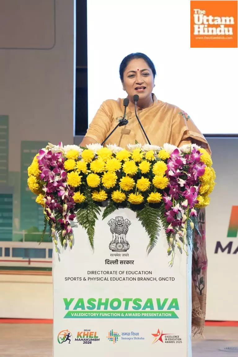 New Delhi (The Uttam Hindu): Delhi Chief Minister Smt. Rekha Gupta on Saturday attended the valedictory ceremony and award presentation of Yashotsav 2026 at Yashobhoomi in Dwarka, where she felicitated meritorious students and athletes. As part of the initiative, 1,200 top- ranking students were given laptops by the Delhi government for their outstanding academic performance. Winners of the Delhi Khel Mahakumbh 2025-26 were also honoured, with the event drawing participation from thousands of young athletes. In addition, 222 high-achieving students from Classes 10 and 12, along with 34 top-performing schools, were recognised.