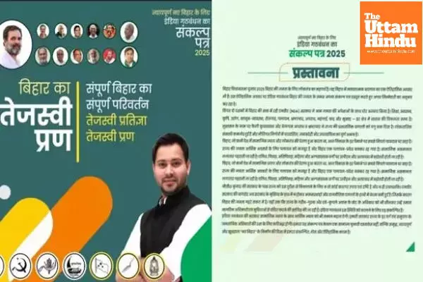 Patna (The Uttam Hindu): Ahead of the Bihar Assembly Elections 2025, the Mahagathbandhan alliance led by the Rashtriya Janata Dal (RJD) released its joint manifesto on Tuesday, titled “Bihar Ka Tejashwi Pran” (Tejashwi’s Pledge for Bihar).