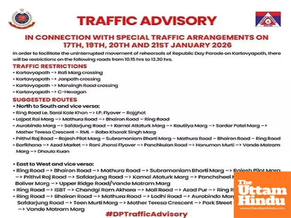 New Delhi (The Uttam Hindu): The Delhi Traffic Police has issued a special traffic advisory in preparation for the Republic Day Parade. Traffic will be strictly restricted on certain major roads and intersections from 10:15 am to 12:30 pm on January 17, 19, 20, and 21, 2026, during the rehearsal on the Line of Duty.