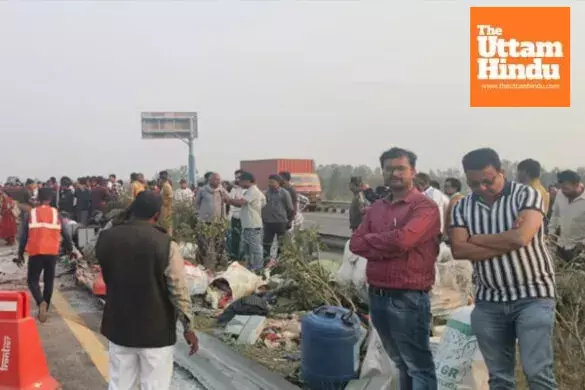 Lucknow (The Uttam Hindu): A tragic road accident occurred in Lucknow, the capital of Uttar Pradesh on Monday evening. A speeding sleeper coach bus suddenly lost control and overturned on the Purvanchal Expressway near Jaukhandi village in the Gosaiganj area. Seven passengers tragically died in this horrific accident, while more than 40 others were seriously injured. Chaos erupted at the scene.