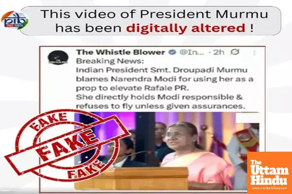 New Delhi (The Uttam Hindu): The PIB Fact Check unit on Wednesday flagged an AI-generated video of President Droupadi Murmu, exposing a Pakistani propaganda campaign spreading false claims on social media. Several Pakistani accounts had alleged that Prime Minister Narendra Modi was using President Murmu to promote Rafale fighter jets.