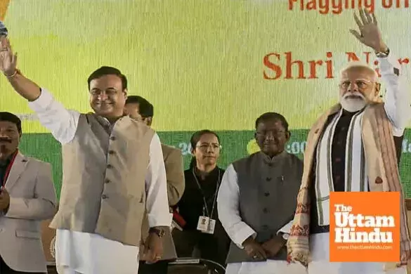 Nagaon/Kaliabor (The Uttam Hindu): Prime Minister Narendra Modi on Sunday laid the foundation stone for the Kaziranga Elevated Corridor project, to be built at a cost of Rs 6,957 crore, in Assam's Nagaon district. He also digitally flagged off two new Amrit Bharat Express trains. Arriving in Kaliabor from Guwahati on the final leg of his two-day visit to Assam, PM Modi formally participated in the project's groundbreaking ceremony.