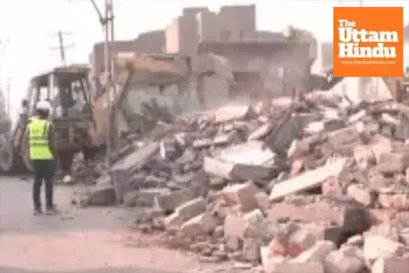 Rajkot (The Uttam Hindu): A large-scale anti-encroachment drive was carried out by the municipal authorities on Sunday in the Jangleshwar area, where bulldozers were used to demolish illegal constructions. The action targeted 1,489 structures built on encroached land, creating unrest among residents who had been living there for decades.