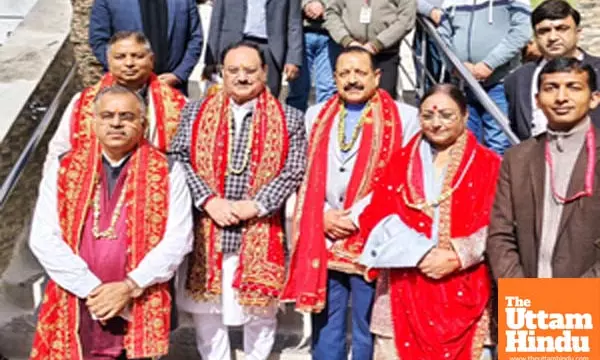 Jammu (The Uttam Hindu): Union Health Minister and Bharatiya Janata Party (BJP) president J. P. Nadda on Saturday paid obeisance at the Mata Vaishno Devi Shrine in Jammu and Kashmir's Reasi district.