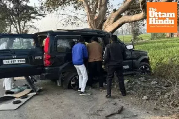Sonipat (The Uttam Hindu): Four young men travelling in a Scorpio were killed and two others seriously injured in a horrific road accident in Sonipat, Haryana, late Friday evening. The men were returning from a wedding in Rohtak. On the way, their Scorpio lost control and struck a roadside tree. The impact was so severe that the front portion of the vehicle was completely damaged.