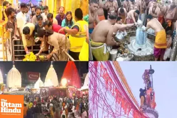 Varanasi (The Uttam Hindu): With the holy festival of Mahashivratri, temples across the country have resonated with the chants of Har Har Mahadev. Devotees have been standing in lines since Brahma Muhurta to have darshan of their deity, but even after seeing the huge crowd, the enthusiasm of the devotees is not decreasing. Long lines have been formed outside the temples in Varanasi and Deoghar since morning for darshan. In Kashi Vishwanath, Baba was adorned with peacock feathers and the entire complex resonated with the chants of Har Har Mahadev.
