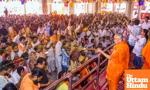 Caption: Jaipur: Devotees celebrate 'Phoolon Ki Holi' during Holi festivities at the historic Govind Dev Ji Temple in Jaipur on Thursday, March 13, 2025.