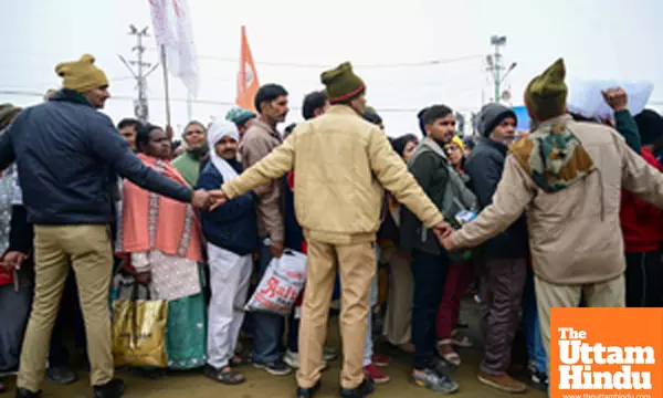 Prayagraj: Police personnel control the crowd at the Triveni Sangam