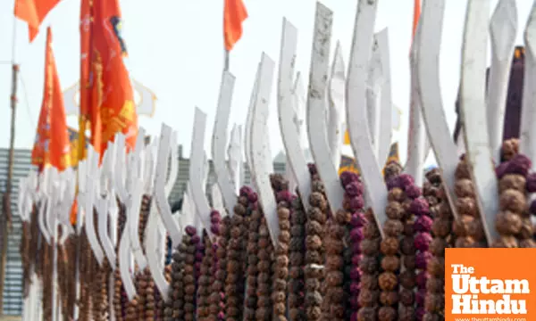Prayagraj: Rows of tridents adorned with Rudraksha beads displayed during the Maha Kumbh Mela 2025