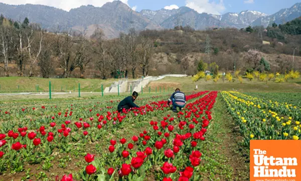 Caption : Srinagar: Workers prepare Asia's largest Tulip Garden for the upcoming Tulip Festival in Zabarwan, Srinagar, on Tuesday, March 18, 2025.