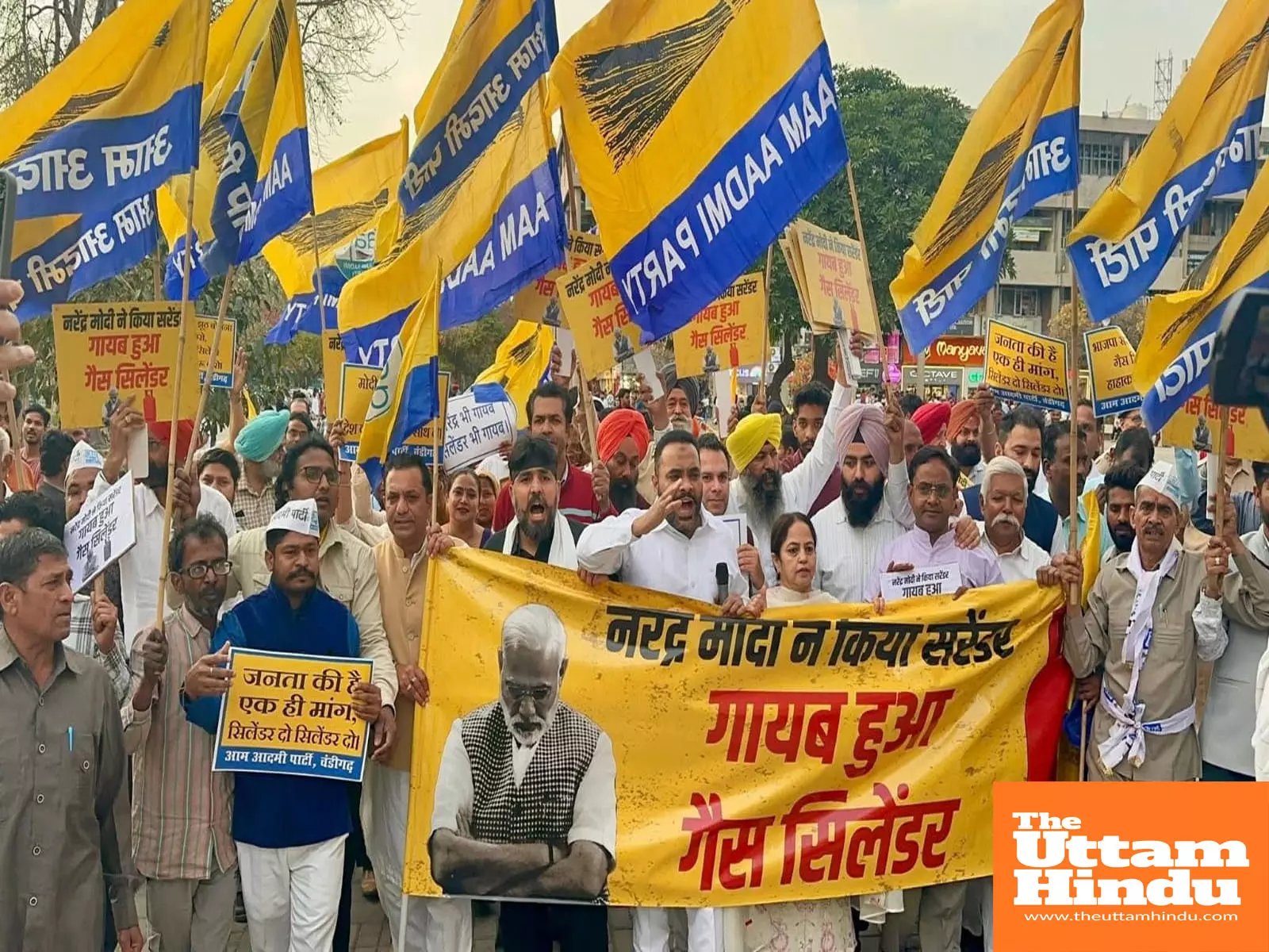 Chandigarh (The Uttam Hindu): The BJP government, which boasts of a "Double Engine," has now become a "Trouble Engine" for the common man. Against the skyrocketing prices of LPG and the 'Artificial Shortage' of gas cylinders deliberately created in the city, the Aam Aadmi Party (AAP) Chandigarh today launched a massive protest against the Central Government at the Sector-17 Plaza (opposite Neelam Cinema).
