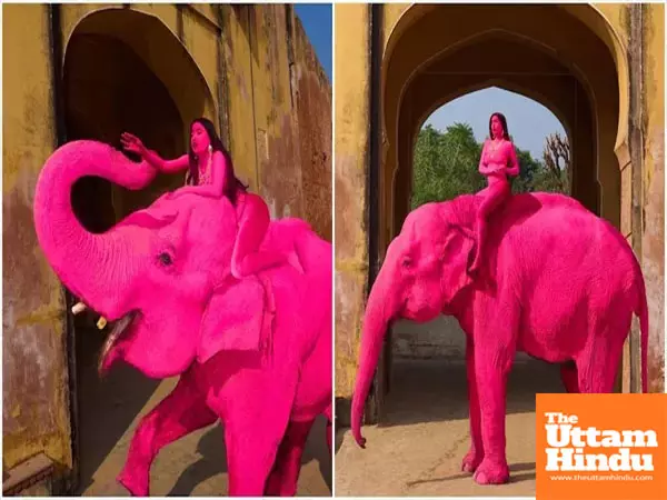 Jaipur (The Uttam Hindu): A shocking incident has emerged from Jaipur, the capital of Rajasthan, sparking a major controversy on social media. In front of a temple, Barcelona-based Russian photographer Julia Buruleva painted a real elephant bright pink for a special photoshoot. Photos of a model sitting on the back of this pink elephant are rapidly going viral on the internet. Animal lovers and common internet users are furious as soon as these photos surfaced, calling them utter cruelty to animals.