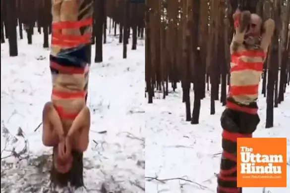 New Delhi (The Uttam Hindu) – A shocking incident involving the Russian army has come to light, where two Russian soldiers were subjected to inhumane punishment by their own commanders for disobeying orders. A video circulating on social media shows the two soldiers tied to a tree, made to stand in the bitter cold wearing only their underwear, and ice was forced into their mouths.