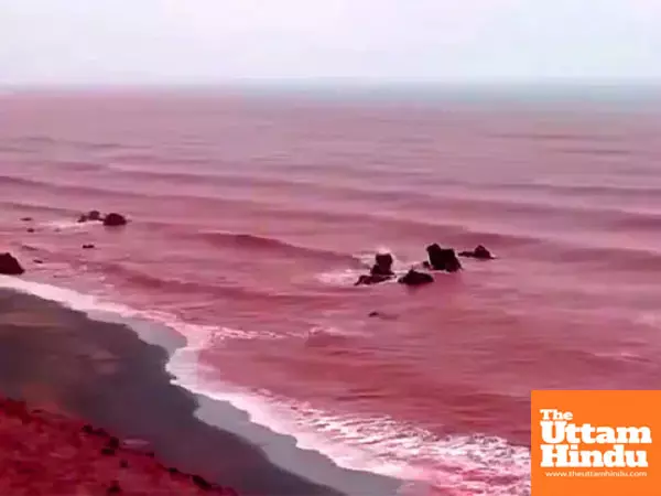 New Delhi (The Uttam Hindu) : Following recent heavy rains on Iran's Hormuz Island, nature created a scene that stunned onlookers. The sand and water on the beach appeared to be a deep blood red. At first glance, it appeared as if blood had rained from the sky, but the reason behind this was entirely natural.