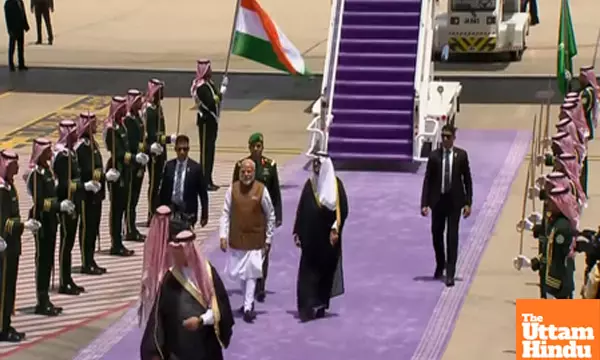 Jeddah (The Uttam Hindu) : Prime Minister Narendra Modi received a rousing welcome at the Jeddah airport on Tuesday afternoon as he began a two-day visit to Saudi Arabia, his third to the Kingdom after his previous visits in 2016 and 2019, at the invitation of Saudi Crown Prince and Prime Minister Mohammed bin Salman. As a special gesture for the State Visit of PM Modi, his aircraft was escorted by the Royal Saudi Air Force as it entered the Saudi airspace. The April 22-23 visit follows the State Visit of Prince Mohammed bin Salman to New Delhi in September 2023 to attend the G20 Summit and co-chair the first meeting of the India-Saudi Arabia Strategic Partnership Council. In his departure statement issued earlier in the day, PM Modi emphasised that India deeply values its long and historic ties with Saudi Arabia that have acquired strategic depth and momentum in recent years.