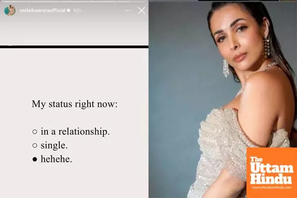 Mumbai, Nov 25 (IANS) Dancing diva and actress Malaika Arora has finally revealed her current relationship status with a hilarious cryptic post on social media. Malaika took to Instagram stories, where she shared a meme which read: “My relationship status right now”. It had the options of: “In a relationship, single and hehehe” written on it. However, it was the third option marked “hehehe”.