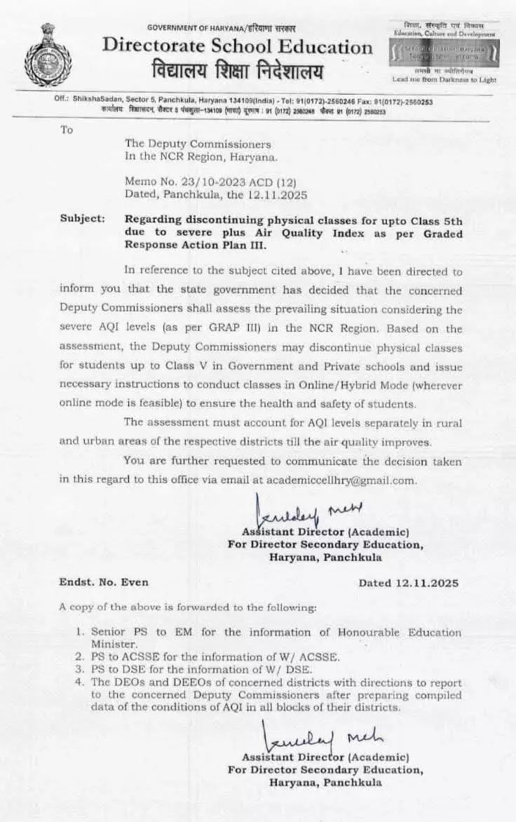 Schools up to grade 5 in Haryana, adjacent to Delhi-NCR, will be closed due to pollution, the Directorate of Education has decided; the authority has been delegated to the DC: In a letter issued by the Directorate of Education, it has been said that the Air Quality Index (AQI) is continuously reaching dangerous levels in various areas of Delhi-NCR. In such a situation, keeping in mind the health of the children, it is necessary that the education of primary classes should be done only through online medium. The Directorate has directed the DCs of all the districts to take a decision after reviewing the local pollution situation and ensure the arrangement of online classes in schools as per the need.