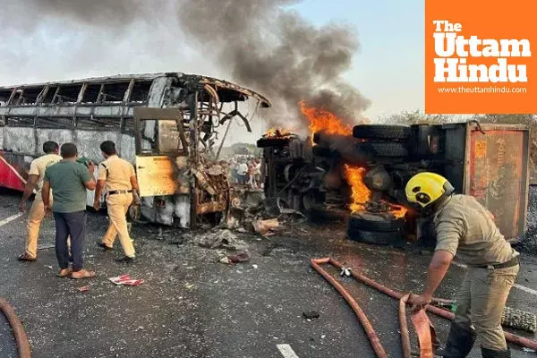 Markapuram (The Uttam Hindu): A horrific road accident took place near Rayavaram area of Andhra Pradesh’s Markapuram, where a private travel bus collided with a tipper lorry. At least 14 people were burnt alive in the incident, while around 18 others sustained injuries.