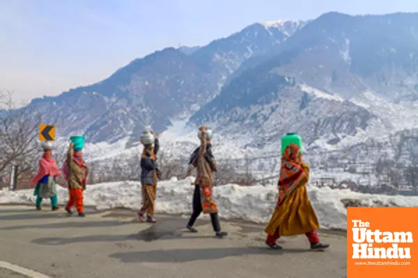 Caption : Ganderbal: Women carry water containers on their heads while walking along a snow-covered road in Gund village of Ganderbal district on Sunday, January 12, 2025.