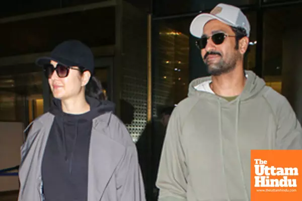 Caption : Mumbai: Actors Vicky Kaushal and Katrina Kaif pose for photos as they arrive at the airport in Mumbai on Saturday, December 28, 2024.