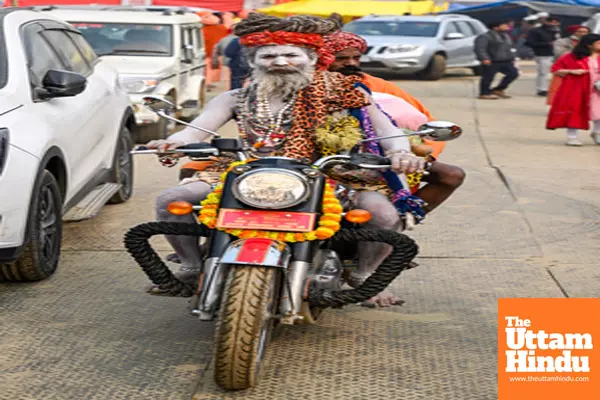 Caption : Prayagraj: Sadhus (Holy Men) arrive on a bike at the banks of the Sangam, the confluence of the rivers Ganges, Yamuna, and Saraswati, ahead of the Maha Kumbh Mela 2025 in Prayagraj on Sunday, January 12, 2025.