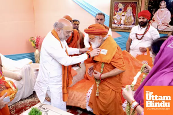 Prayagraj: Union Home Minister Amit Shah meets Guru Sharananand Ji Maharaj and Revered Swami Govinddev Giri Ji Maharaj