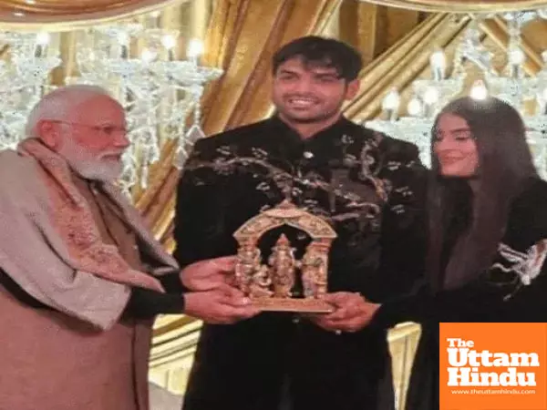 New Delhi (The Uttam Hindu): Prime Minister Narendra Modi attended the wedding reception of Olympic gold medalist Neeraj Chopra and tennis player Himani Mor. A video of this special occasion has surfaced, showing Prime Minister Modi presenting gifts to the newlyweds, posing for photos with them, and blessing them. During the event, PM Modi also had a cordial conversation with Neeraj and Himani.