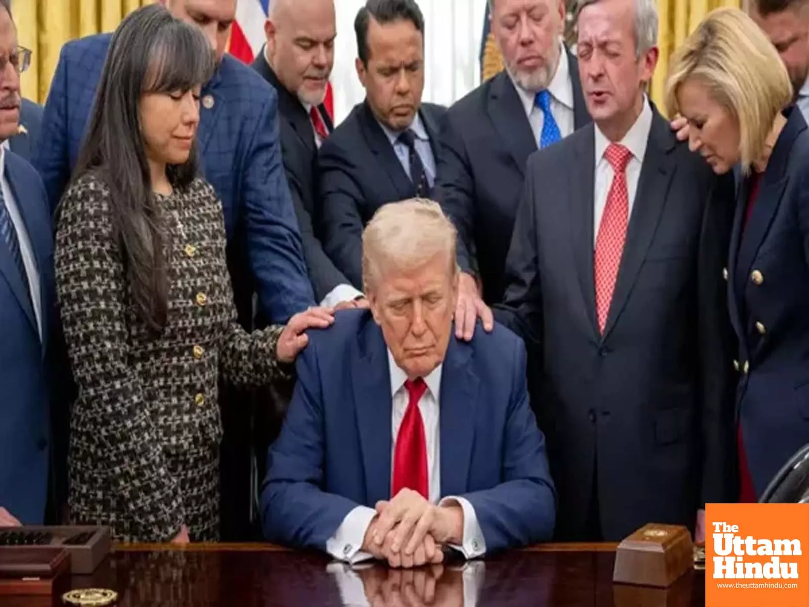 Washington (The Uttam Hindu): Amid the fierce and destructive war with Iran, a shocking video of US President Donald Trump has surfaced which has caught the attention of the entire world. Probably for the first time in history, Trump has been seen publicly worshipping and praying in a serious posture in the Christian way in the Oval Office of the White House. The video of this special prayer for the protection of the nation and victory in this great war is spreading like wildfire on social media. Dan Scavino, a close aide of Trump in the White House, has shared the video of this historic moment and wrote - 'God Bless the America'.