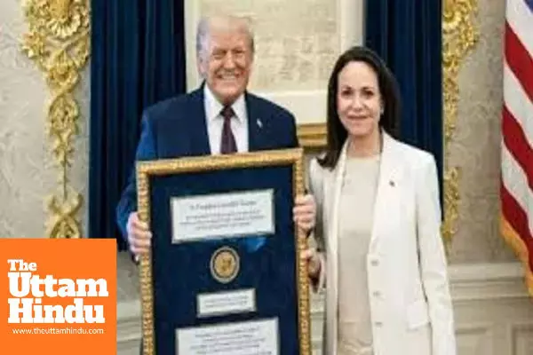Washington (The Uttam Hindu): Venezuelan opposition leader and Nobel Peace Prize laureate Maria Corina Machado said that during a closed-door meeting at the White House, she presented her Nobel Peace Prize medal to US President Donald Trump. She described the gesture as a historic symbol of the shared struggle for freedom between the two nations. Speaking to reporters in Washington after the meeting, Machado said, “I gave the Nobel Peace Prize medal to the President of the United States.”